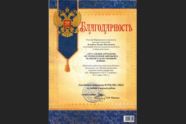 В ВУНЦ ВВС «Военно-воздушная академия имени профессора Н.Е. Жуковского и Ю.А. Гагарина» 10 марта 2015 г. состоялся научный «круглый стол» «Актуальные проблемы истории Второй мировой войны и Великой Отечественной войны». Проблемы истории обсуждали 8 докторов и 15 кандидатов наук из вузов Москвы, Воронежа и Российской академии наук.
